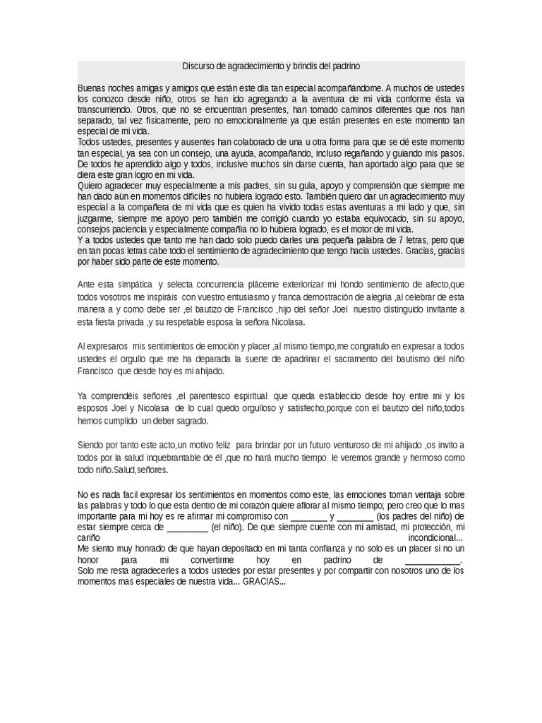 Discurso De Agradecimiento Y Brindis Del Padrino Padrino Bautismo