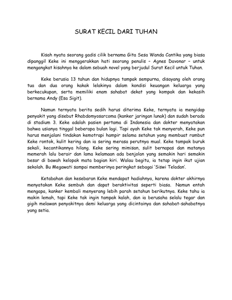 Surat Kecil Untuk Tuhan Gita Sesa Wanda Cantika Yg Biasa Di Sp Keke Seorang Gadis Remaja 13 Thun Brainly Co Id