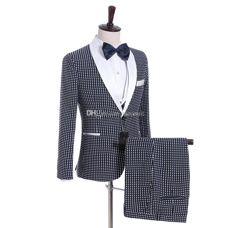 Compre Padrinos De Boda Manton Solapa Novios Esmoquin Azul Con Lunares Blancos Trajes De Hombre Boda Fiesta De Graduacion Mejor Hombre Blazer Novio Chaqueta Pantalones Chaleco Corbata